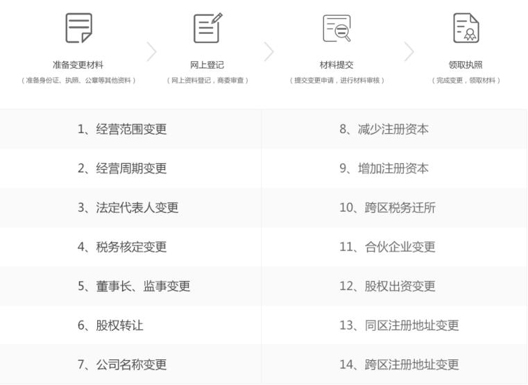 3、公司變更的事項(xiàng)類型包括:公司名稱、住所、法定代表人、注冊(cè)資本、經(jīng)營范圍、公司組織形式、股東信息、公司合并分立等。